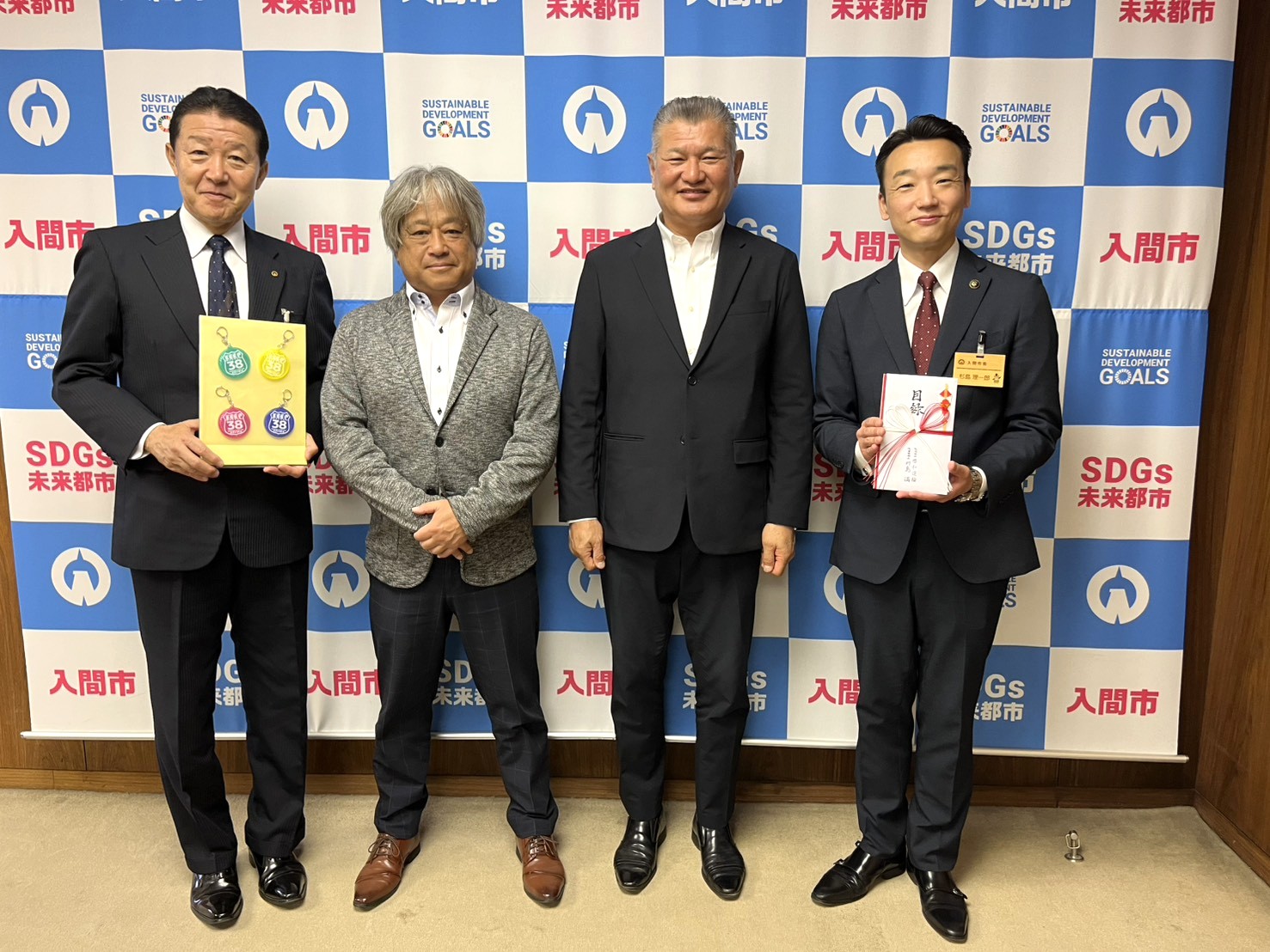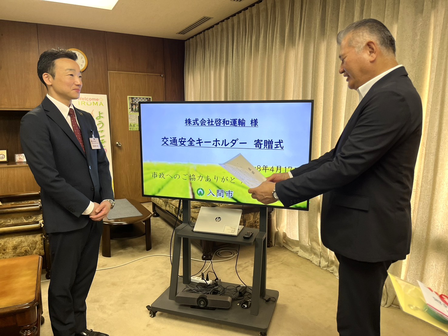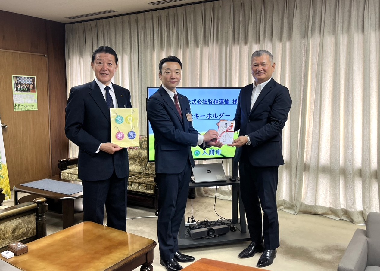 2026年4月17日、当社代表は、総務企画部部長とともに、入間市内の小学生へ交通安全の願いを込め、キーホルダー7,000個を寄贈し「寄贈式」へ出席いたしました。